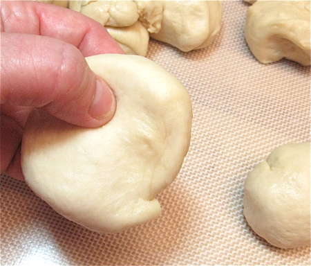 Next, shape each piece into a ball. Let's do one at a time. First, flatten the piece of dough a bit by pulling on the edges, smoothing its top.