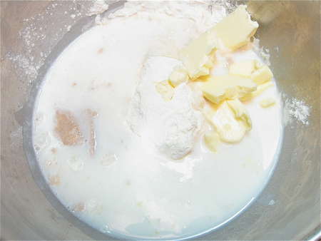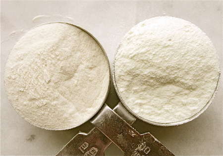 So, what's with the white powders here? They're two of my “gotta have” white bread ingredients: potato flour, and Baker's Special Dry Milk. The potato flour adds moistness and keeping quality; the Special Dry Milk, a great rise.