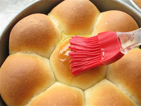 Remove the buns from the oven, and immediately brush with melted butter. You'll need 1 to 2 tablespoons melted butter, depending on how generous you are. Trust me; this is a time for generosity.