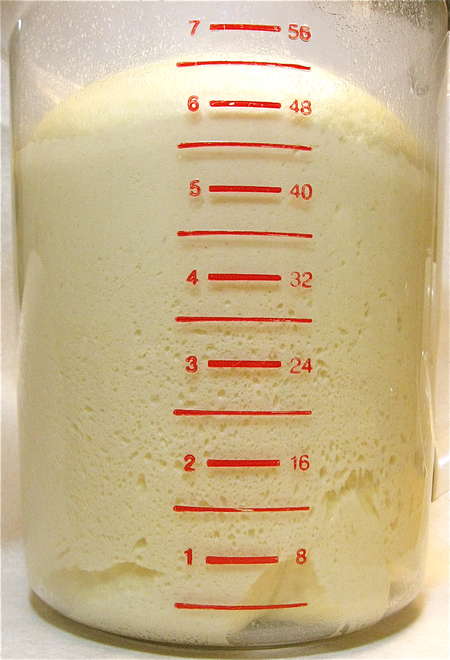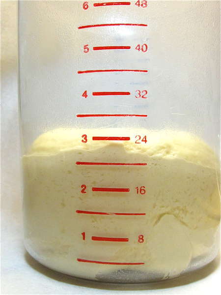 Let the dough rise till it's doubled; this'll probably take 60 to 90 minutes. Look at those lovely air bubbles around the bottom – the yeast is growing, giving off CO2, stretching that gluten in the flour just like a balloon.