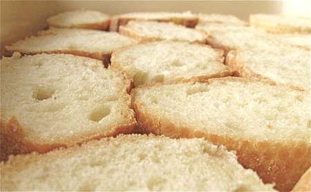 You'll want to slice the bread 1/2” thick. It helps if all the pieces are the same thickness, so slice carefully. Cut enough slices to snugly line the bottom of a 9” x 13” pan. Set them aside while you make the syrup and custard.