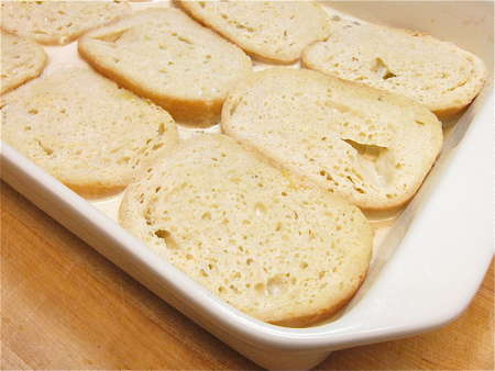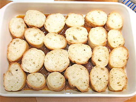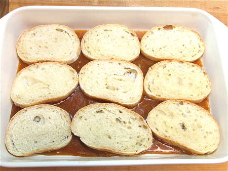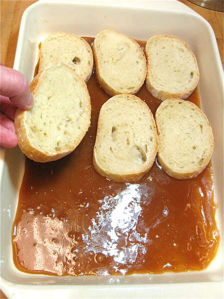 Lay the slices of bread in the pan, atop the glaze.
