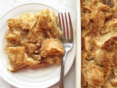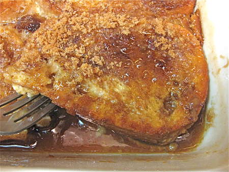 And here's what it looks like in a different incarnation: with the bread diced, instead of sliced (as though you were making bread pudding) and served right side up, without flipping to reveal the syrup.