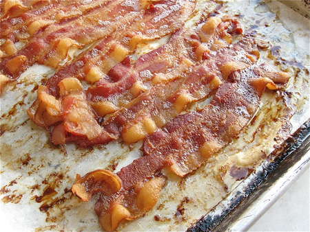 If you're totally on the ball, you will have made your bacon as the French toast was baking. I like to lay bacon on parchment on a rimmed baking sheet, and bake it right along with the French toast, in the oven. Bacon bakes beautifully: flat, golden brown, and straight. And the parchment makes cleanup a snap.