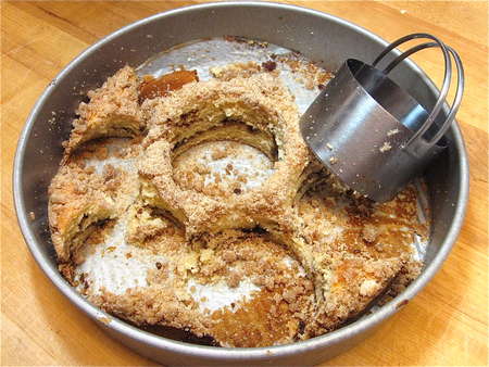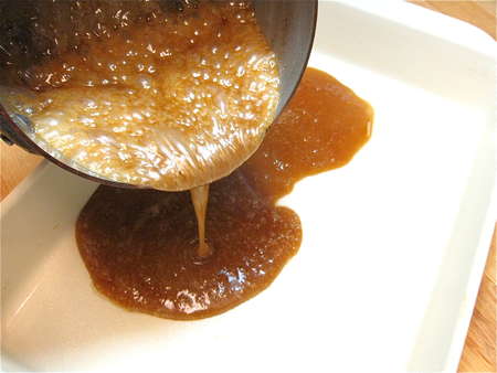 Pour the glaze into your lightly greased 9” x 13” pan, spreading it to the corners. I'm using stoneware here; it makes a nicer presentation at the breakfast table.