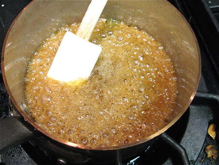 Melt 8 tablespoons (113g) butter in a saucepan, and stir in 1 cup (213g) brown sugar and 2 tablespoons honey, maple syrup, or corn syrup. Bring the mixture to a gentle boil, cooking until the sugar melts.