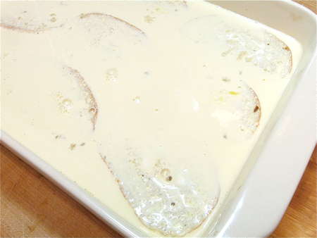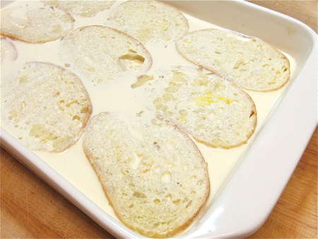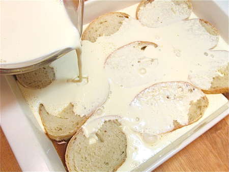 Within minutes, the bread will start to absorb the custard.