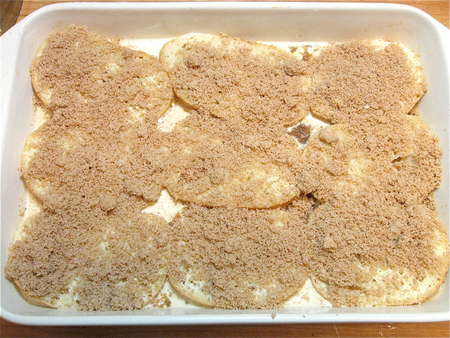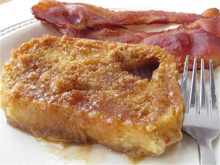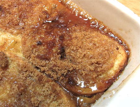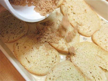 This makes a very sweet French toast. Cut the amount of topping in half, if you like. Or sprinkle with simple cinnamon-sugar. Or even just cinnamon; leaving the bread naked is kind of gloomy looking, so DO sprinkle it with something, OK?