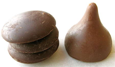 Here's a test of three different chocolates: Onyx wafers (bottom); Burgundy chunks (middle); and a Hershey's Kiss (top). The Kiss softened, but didn't melt, unlike the other two chocolates.