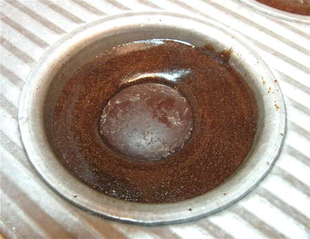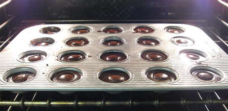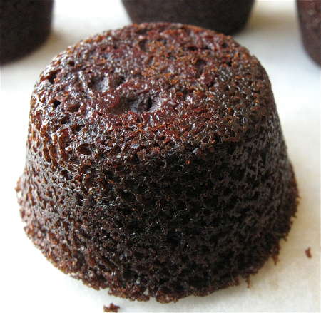 Serve immediately. Upside-down works best, so the chocolate disks (which have sunk to the bottom) are now on top...