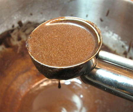 Melt 8 tablespoons (113g) butter, and stir in 1/4 cup (21g) Dutch-process cocoa powder, 1/2 teaspoon espresso powder, and 1/2 cup (113g) hot water.