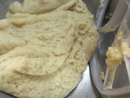 Pour the liquid into the dry all at once and mix for 2 minutes on medium-low speed until a very soft dough forms. It won't be a super-smooth dough, but rather a bit rough and “orange peel” looking. Don't worry, the texture will smooth out during the shaping. This dough also has a bit of an oily texture to it, so it doesn't stick to your hands or to surfaces.