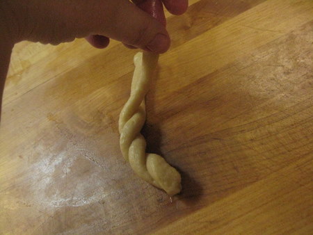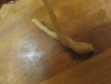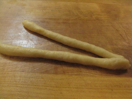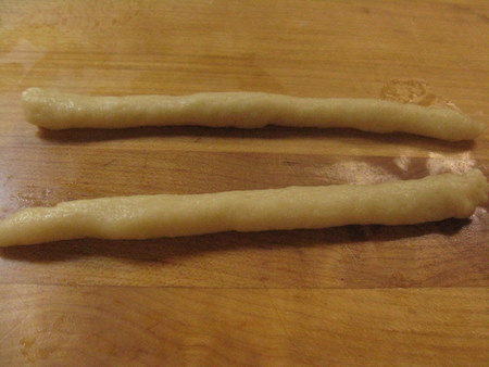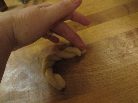 Roll 2 pieces of dough out to about 6 inches long.