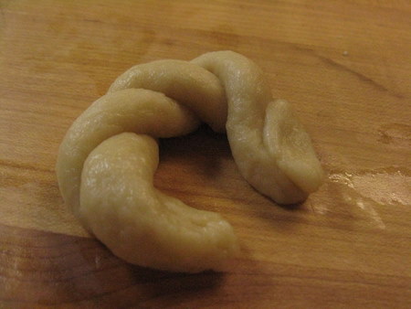 Pick up one strand and drape it across the other strand. Drape rather loosely so that the strands won't be too tight and burst during baking.