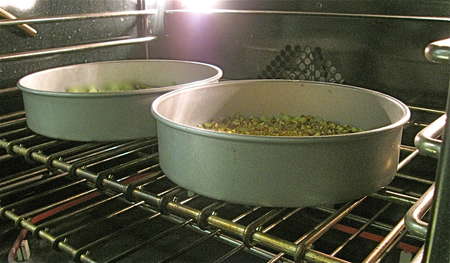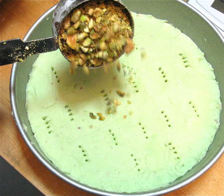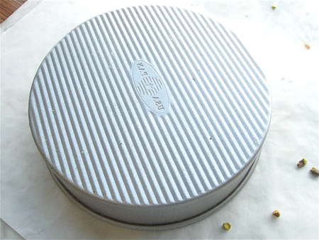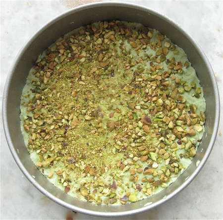 Sprinkle 1/3 cup (43g) chopped pistachios into each pan.