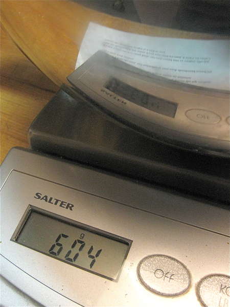 Divide the dough in half. A scale makes this easy. 604g of dough in the bowl...