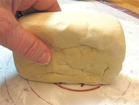Lightly flour a work surface (a silicone rolling mat works well here), and remove the dough from its rising bowl. It won't feel like normal yeast dough; it'll be more clay-like. Shape the dough into a 3” x 5” rectangular block.