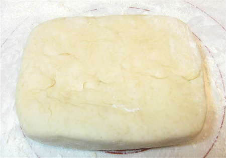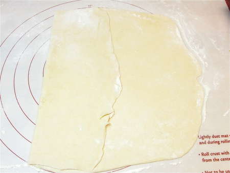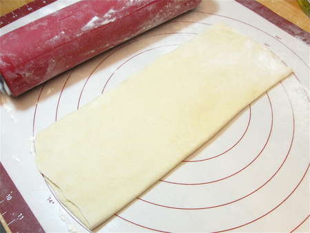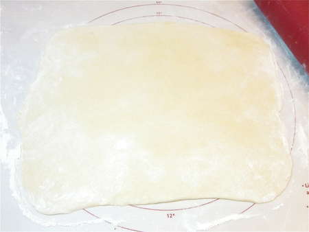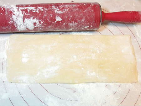 Roll it into a rough 13” x 15” rectangle; it'll be quite thin. Be sure to keep the rolling surface well-floured, to avoid sticking.