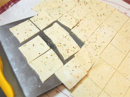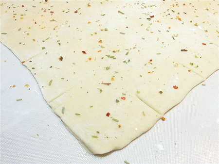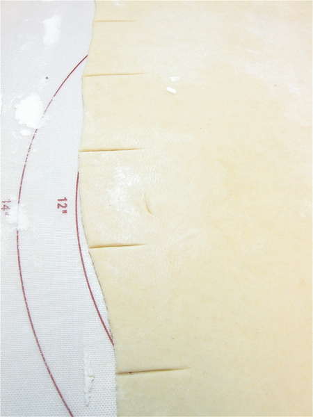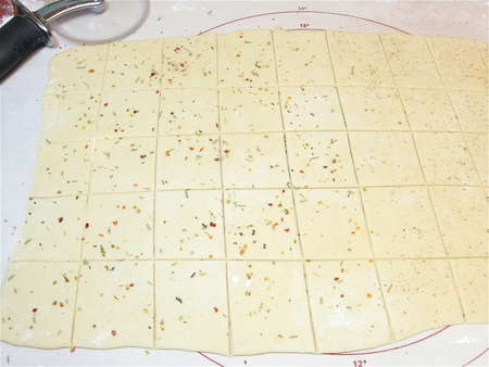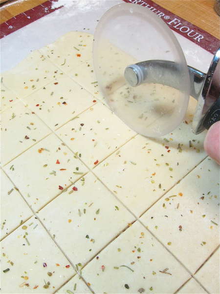 Notch the edges of the dough at 2” intervals; this will help you cut nice, straight 2” crackers.