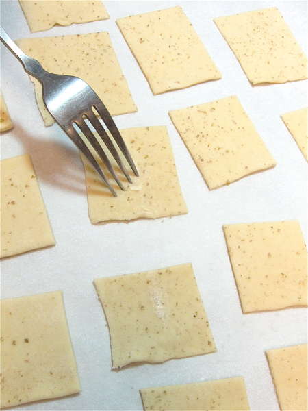Put the crackers fairly close together, as they'll shrink as they bake, rather than spread. Prick each one once or twice with the tines of a fork.