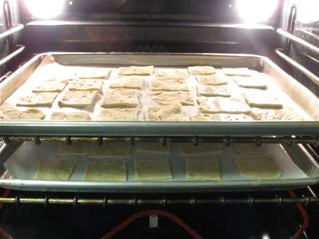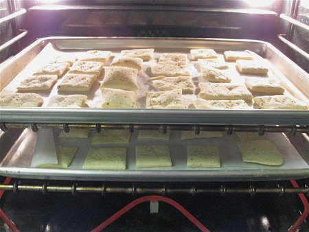 Leave the pans of crackers on the oven rack; they're going to cool down right in the cooling oven, in order to preserve their crispness. Keep your eye on them for the first couple of minutes; if for some reason your oven isn't cooling off quickly, and the crackers are continuing to brown, pull the rack out partway.