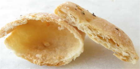 On the left, a cracker I forgot to poke with a fork, prior to baking – a perfect little balloon! On the right, one that was poked; light, flaky layers.