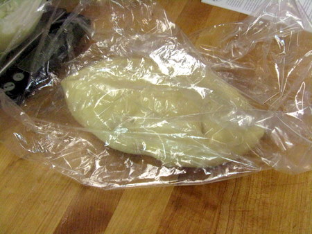 Set one half of the dough aside under plastic wrap, so that it doesn't dry out as you roll the first half. You're shooting for approximately 10” x 15”.