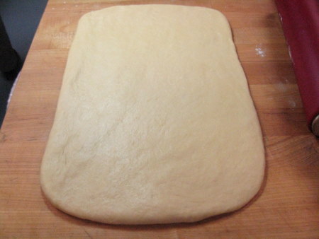 Pat the dough into a rough rectangle. Dough is like an elephant. It has a memory, and if you set it up as a rectangle, it will remember that it wants to be a rectangle. If you just plop it down and start rolling, it won't have a good idea of what shape it should be.