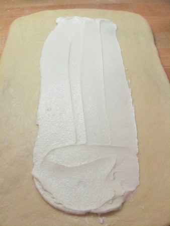 Spread half of the cream filling down the center of the rectangle. Leave about 2” on the sides and 1” on the top and bottom bare.