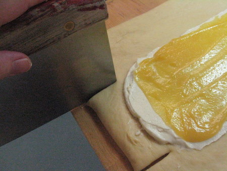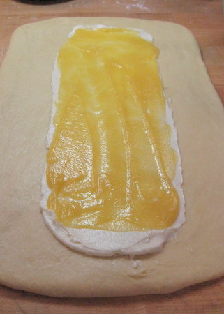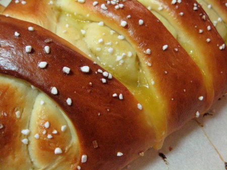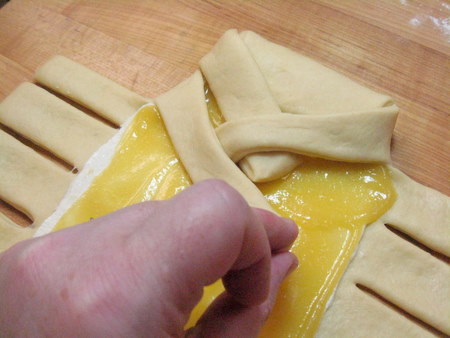 It's Braided Lemon Bread: a sweet, egg-enriched dough surrounding a sweetened cream cheese filling with a luscious layer of lemon curd and a sprinkling of pearl sugar. The truly impressive thing about this loaf, besides the lovely lemon, is the presentation. The loaf is mock braided, a very simple technique that never fails to draw ohhs and aaahs from those to whom you serve it. All you'll need is a sturdy rolling pin and a bench knife or scissors to cut the dough, and you'll be wowing the crowds in no time.