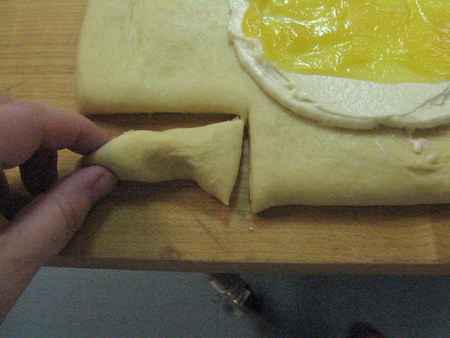 Next cut in from the side edges to just the edge of the filling. Remove the little piece of dough. Do this on all four corners.