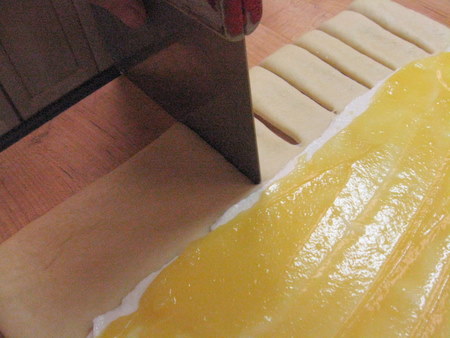 Now for the fun part, the mock braid. Begin by using your bench knife to cut the top and bottom of the rectangle, even with the edges of the filling, about 1” deep.