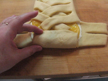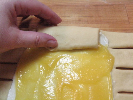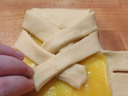 Draw the first opposite strip inward, again at an angle. It should over the bottom corner of the top piece of dough, and crisscross over the first side strip There should be a small gap in the very center, exposing the filling.