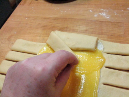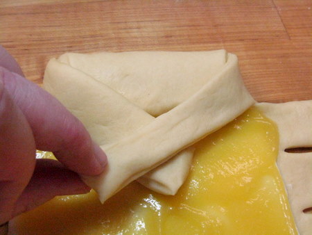 Fold down the top strip over the filling. For every fold, keep in mind that the bread will still need to rise, so be gentle and don't pull tightly.