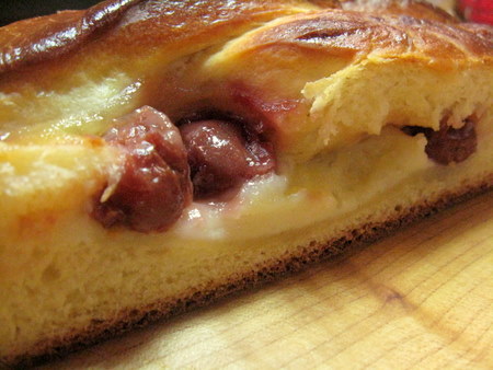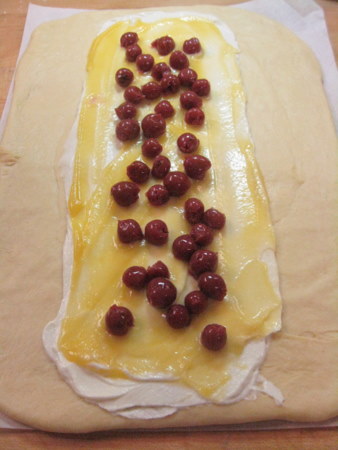Let's backtrack a bit. When you're filling the loaf, you can add fresh or canned or frozen fruit. Remember, less can be more and too much can really be a hassle. Here, I've added some cherries to my second bread.