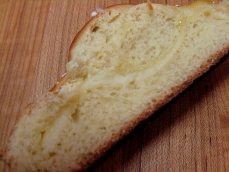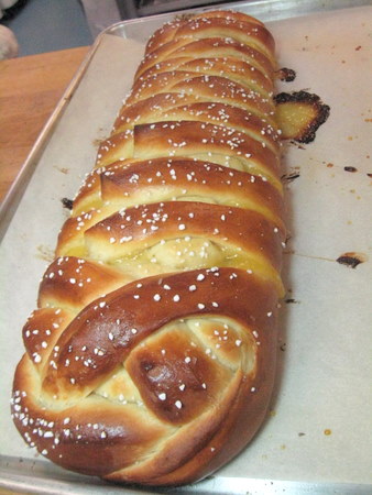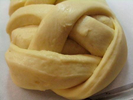 Back to our beautifully risen loaves. This loaf is the one I forgot to put on parchment before beginning my braid. It survived the move, but just barely. It took a lot of tucking and nudging to get it back into shape, and some of the strips pulled out towards the bottom of the loaf. Oh well, live and learn. YOUR bread will look more like the top of the loaf.