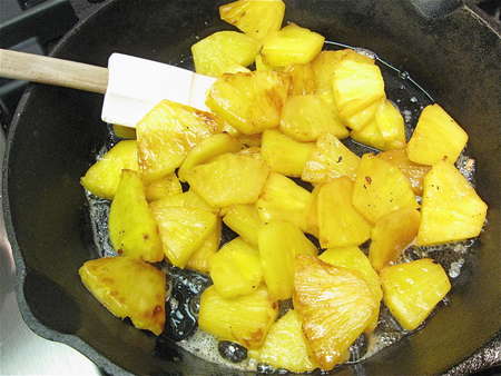 We'll start with the Hawaiian filling. Lightly grease a frying pan or skillet, and sauté pineapple till lightly browned. How much? One fresh pineapple, peeled, cored and cut into chunks; or two 20-ounce cans of pineapple chunks, well drained. Either way, you need 4 to 5 cups of pineapple chunks.