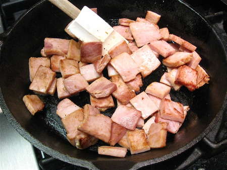 Remove the pineapple, and sauté 1 pound of thick-sliced ham, cut into squares.
