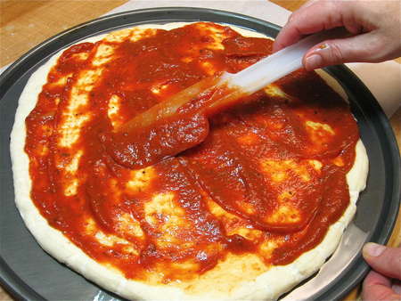 Spread each crust with as much pizza sauce as you like; Sue uses about 1 cup for a 14” pizza.
