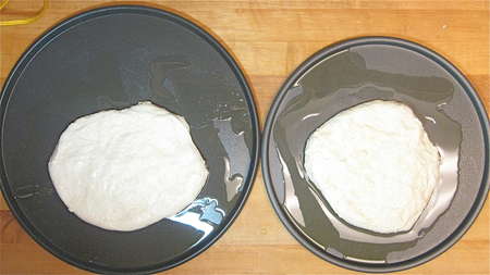 If you're using pans, drizzle olive oil into the bottom; this will make the bottom of the crust crunchy and super-tasty.