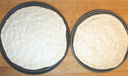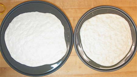 Shape each piece of dough into a 10" to 14" disk (thick crust vs. thin crust), and place in the prepared pans.