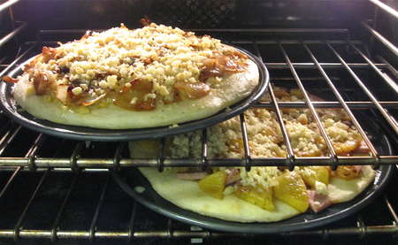 Take the hot crusts out of the oven. Top with pineapple and ham; pizza sauce is optional.