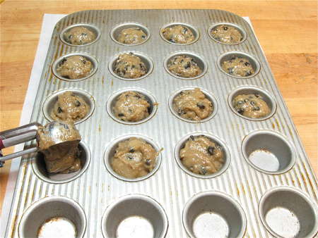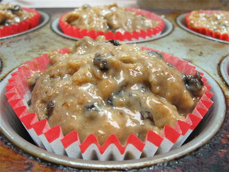 Preheat your oven to 375°F. Lightly grease a standard muffin pan, or line with paper cups, and grease the cups. Use as many wells as you like; since this recipe can live in the fridge for a couple of weeks, there's no need to bake 12 muffins all at once.