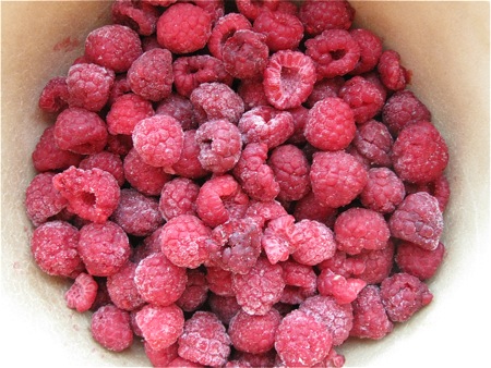 Let's make the raspberry sauce first. You'll need 3 1/2 to 4 cups raspberries; frozen are fine.