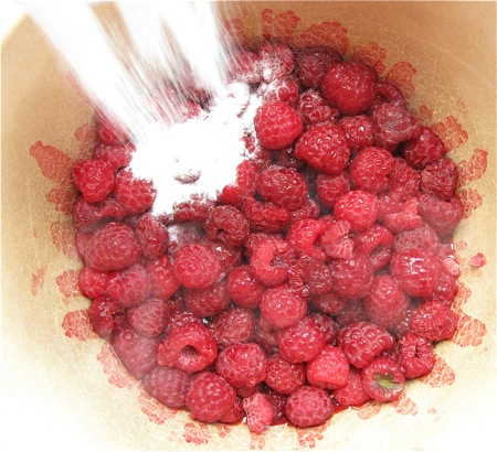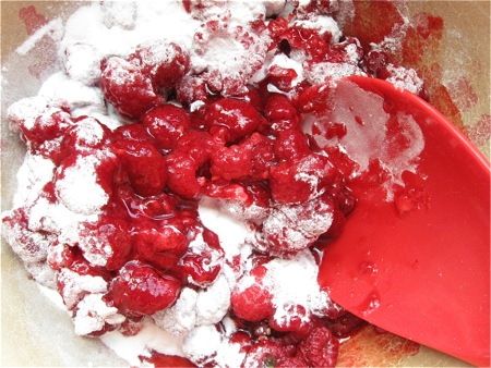 Mix the berries with 1 tablespoon Pie Filling Enhancer, for thickening; and 2 tablespoons sugar, or to taste. The Pie Filling Enhancer will keep the raspberries from separating into liquid juice and berries.