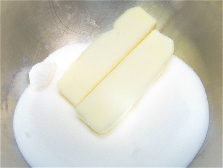 Put 1 cup room-temperature unsalted butter, 2 cups sugar, and 1 1/4 teaspoons salt in a mixing bowl.