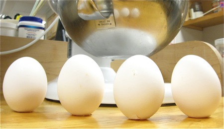 Don't you love how these eggs are standing at attention, unable to roll around (and fall on the floor)? It's a little trick I learned recently at our Baking Education Center. Hold an egg with its fat (wide) part towards the bottom, and give it a gentle tap on the counter. It'll just barely crack, at the same time forming a flat base for itself. No rockin’ – no rollin’!