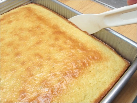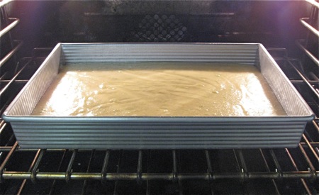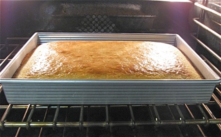 Bake the cake for 25 to 33 minutes, or until the top is starting to brown and a cake tester inserted into the center comes out clean.