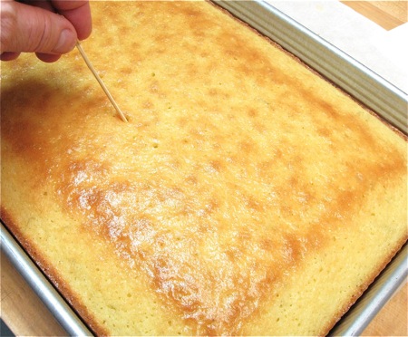 Use a skewer or toothpick to poke the top of the cake all over. Don't poke all the way to the bottom of the pan; just about halfway down.