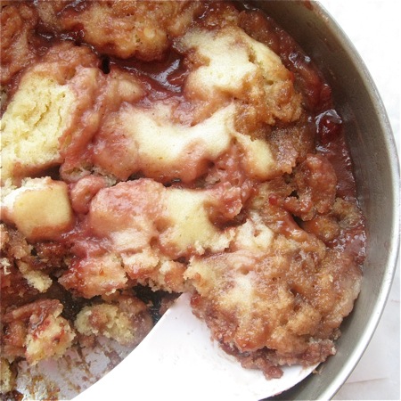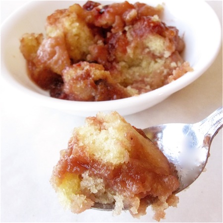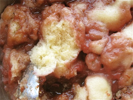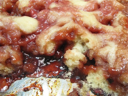 Unbaked cake? Nope. Cake “baked” in an electric skillet, where a bottom layer of sugar, butter and fruit bubbles up over cake batter dolloped on top.